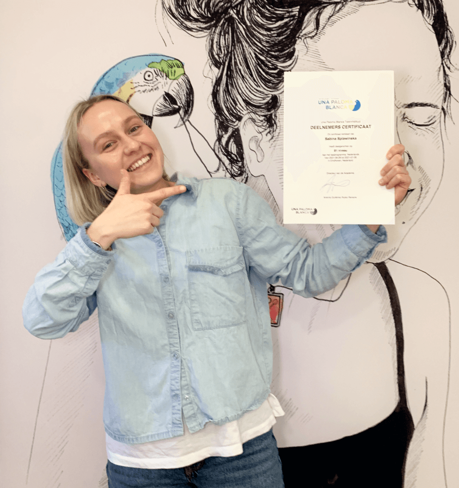Yay! You finished your course. Congratulations! After completing your course at Una Paloma Blanca we are happy to award you with a certificate of Participation